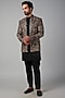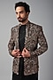 Featuring a black indowestern jacket in velvet base with thread embroidery. It is paired with a kurta having cutdana work and aligarhi pants. Perfect wear for weddings or sangeet ceremonies.