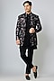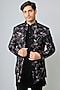 Featuring a black open jacket in velvet base with threadwork. It is paired with a kurta and trousers. Style it with mojaris for a festive occasion, wedding, sangeet or engagement ceremony.
