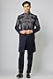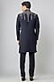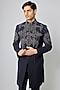 Featuring a blue indowestern in boomario base with moti embroidery. It is paired with trousers. Style it with mojaris for a wedding, sangeet or engagement ceremony.