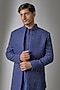 Featuring a blue indowestern jacket in silk base. It is paired with a kurta and trousers. Style it with mojaris for a festive occasion, wedding or engagement ceremony.
