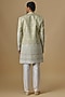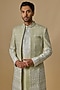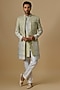Featuring a green open jacket in silk base with mirror, threadwork and machine embroidery. It is paired with a kurta and aligarhi pants. Style it with mojaris for a wedding, mehendi, sangeet or engagement ceremony, exuding charm and elegance.
