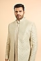 Featuring a green open jacket in silk base with mirror work. It is paired with a kurta and trousers. Style it with mojaris for a wedding, mehendi or sangeet ceremony.
