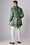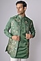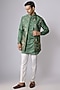 Featuring a green open bundi jacket in silk base with threadwork. It is paired with a kurta and aligarhi pants. Style it with mojaris for a festive gathering, wedding, mehendi ceremony or cultural celebrations.