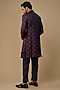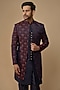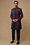 Featuring a maroon indo-western jacket in suiting fabric base with patch embroidery. It is paired a kurta and silk blue pants. This attire would be an excellent fit for a wedding or an engagement ceremonies.