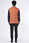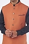 Featuring an orange bundi jacket in a matka silk base. It is paired with a shirt and pants. Perfect for a festive occasion, engagement or sangeet ceremony.