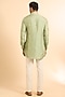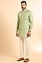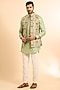 Featuring a pastel green open bundi jacket in silk base with threadwork. It is paired with a kurta and aligarhi pants. Style it with mojaris for a cultural event, wedding, mehendi, engagement or sangeet ceremony.