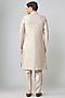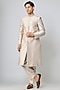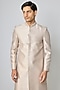 Featuring a pink indowestern in silk base with hand and machine embroidery. It is paired with trousers. Style it with mojaris for a wedding, sangeet or engagement ceremony.