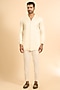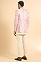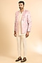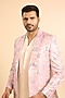 Featuring a pink open blazer in silk base with print. It is paired with a kurta and trousers. Style it with mojaris for a wedding, engagement or sangeet ceremony.