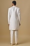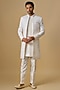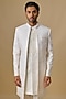 Featuring a white open jacket in silk base with mirror, threadwork and machine embroidery. It is paired with a kurta and aligarhi pants. Style it with mojaris for a wedding, sangeet or engagement ceremony, exuding charm and elegance.