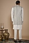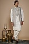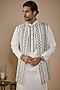 Featuring a white open bundi jacket in silk base with thread embroidery. It is paired with a kurta and aligarhi pants. Perfect attire for any festive occasion or sangeet ceremony, exuding traditional charm and elegance.