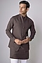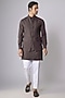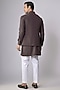 Featuring a wine bundi jacket in suiting base. It is paired with a kurta and aligarhi pants. Style it with mojaris for a festive gathering, wedding ceremony or cultural celebrations.