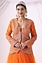 Featuring an orange jacket in raw silk base with zari and sequins hand embroidery, including scalloped edge details. It is paired with a crushed silk skirt. Accentuate it with statement jewellery and heels, perfect for wedding receptions, festive soirees, or sangeet nights.