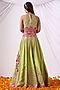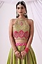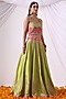 Featuring a parrot green lehenga in banarasi chanderi base with sitara and zari embroidery. It is paired with a banarasi chanderi halter-neck blouse and a silk organza dupatta having boota embroidery. Accentuate it with statement jewellery and heels, perfect for wedding receptions, festive soirees, or sangeet nights.