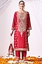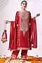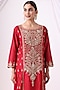 Featuring a red straight-cut kurta in chanderi base with zari embroidery. It is paired with dola silk palazzo pants and a an organza dupatta. Accentuate it with statement jewellery and heels, perfect for wedding receptions, festive soirees, or sangeet nights.
