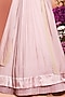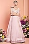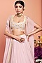 Featuring a blush pink pleated skirt in chiffon, organza, and crepe base with sequins, dabka, beads, and pearls embroidery. It is paired with a matching blouse and a scalloped cape.