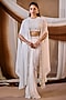 Featuring an ivory cape in silk crepe and organza base with embroidery. It is paired with a draped skirt and a crystal embellished top. Accentuate it with statement earrings and heels for weddings or sangeet ceremony.