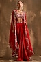 Featuring a rust red cape in silk crepe and organza base with resham, pearls and dabka hand embroidery. It is paired with an embroidered crop top and a draped skirt. Style it with dangler earrings and heels for a complete look.