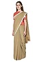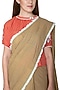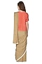 Featuring a beige saree in handloom cotton base with screen printed stripes and frill border. It is paired with a matching blouse having keyhole opening, handcrafted beaded potli button, pompom lace including floral aari and bead embroidery.