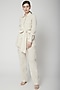 Featuring a beige blazer in khadi base with a belt. It is paired with pants. Accentuate it with block heels and minimal jewellery, perfect for office wear, formal events or elegant daytime outings.