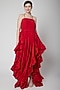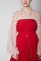 Featuring a red asymmetric dress in cotton linen base. It is paired with hot shorts and a kota polka dot block printed blouse. Accentuate it with statement earrings and heels for evening wear.