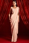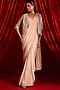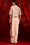 Featuring a salmon pink cape in chiffon, net and sequins organza base with geometric pattern, floral motifs, beadwork and mirror embroidery. It is paired with a blouse, a belt and a saree. Accentuate with statement earrings and heels for weddings or sangeet ceremonies.
