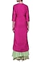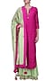 Featuring a rani pink kurta in raw silk with embellished neckline. It comes along with mint green double layer sharara pants in georgette and matching green dupatta in chanderi with embroidery.