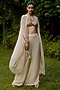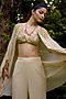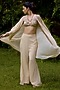 Featuring a cream cape in georgette base with print. It is paired with a sequin hand embroidered bralette and silk crepe bell-bottom pants. Accentuate it with statement jewellery and heels for a festive occasion, cocktail or sangeet ceremony.