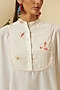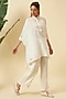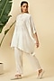 Featuring an ivory asymmetric top in cotton base. It is paired with straight pants. Style it with pearl studs, a suede tote bag and strappy heels, perfect for warm summer days and relaxed holiday styling