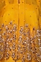 Featuring a lilly ochre cape in khadi base with gota threads, sequins and cutwork embroidery. It is paired with contrasting yellow sharara pants.