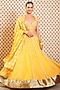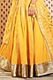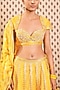 Featuring a pitambari yellow lehenga in organdy base with gota lace and dabka hand embroidery. It is paired with a matching cotton silk blouse and a butta print dupatta.