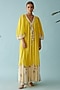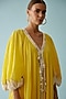 Featuring a yellow maxi dress in cotton base with frill, banana tree print and hand-braided tassel detailing. Style it with dangler earrings and heels for casual or vacation wear.