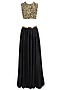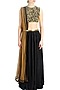 This set features a black sleeveless crop top in linen with golden embroidery all over. It has golden metallic detailing in leaf pattern on the side. It comes along with black lehenga with a metal waist band detail in leaf pattern in silk and a golden net dupatta with black borders.