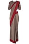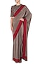 Featuring a grey pre-stitched saree in georgette base with red and maroon borders. It comes along with a matching floral embroidered blouse.