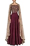 Featuring a maroon anarkali in dupion silk with embroidered and raglan sleeves with sheer net shoulders. It is paired with a nude dupatta in net with scattered motifs and scallop border.