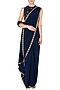 Featuring a navy blue pre-stitched saree in georgette base with scallop borders. It comes along with a matching floral embroidered blouse.