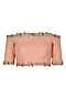 Featuring a nude saree in net with floral hand embroidery on pleats and embellished scalloped border. It is paired with pink off shoulder blouse with embroidery.