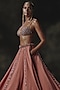 Featuring a pink lehenga in volvo base. It is paired with a strappy blouse having holographic beaded work. Accentuate it with pearl jewellery and heels for a graceful, ethereal look, perfect for engagement ceremonies or sangeet nights.