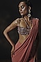 Featuring a pink pant saree in volvo base with a string beaded pallu. It is paired with a bustier having bead embroidery. Accentuate it with statement earrings and strappy heels for a bold, contemporary look, perfect for sangeet nights, cocktail parties or modern festive celebrations.