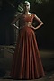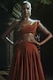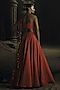 Featuring a rust Kali flared lehenga in volvo base. It is paired with a blouse having an attached metal string beaded drape. Accentuate it with pearl jewellery and heels for a graceful, ethereal look, perfect for engagement ceremonies or sangeet nights.