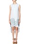 Featuring a vintage blue high low lace dress, set in polyster base. It is appliqued with floral motifs along the hemline and all over the back. It has a small keyhole on the front and a concealed zipper closure on the side. FIT: Fitted at the bust.