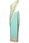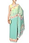 Featuring a turquoise blue saree in polyester base with multi coloured floral print on the pallu and around the hem along with striped and diamond print on the bottom.