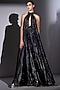 Featuring a black halter maxi dress in lurex georgette base with galaxy print and noir studs embroidery. Accentuate it with statement earrings and sleek heels for a bold, modern look, perfect for cocktail evenings, after-parties, fashion events, or upscale night-outs.