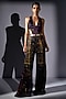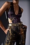 Featuring a purple cut-out bodysuit in sequins georgette base with galaxy print. It is paired with pants. Accentuate it with statement earrings and sleek heels for a bold, modern look, perfect for cocktail evenings, after-parties, fashion events, or upscale night-outs.