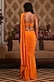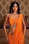 Featuring a bright orange draped sharara saree in crepe base. It is paired with an embroidered blouse. Accentuate it with diamond jewellery, an embellished clutch and a sleek hairdo for a stylish ensemble, ideal for a cocktail, sangeet or haldi ceremony.