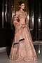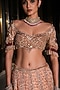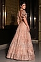 Featuring a golden peach lehenga in net base with hand embroidery. It is paired with a hand embroidered blouse and a dupatta. Accentuate it with statement diamond or zircon necklace set and metallic heels for a refined finish. Ideal for weddings, sangeet or engagement ceremonies.
