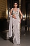 Featuring an ivory metallic draped saree in foil georgette base. It is paired with a hand-embroidered corset blouse. Accentuate it with statement diamond or zircon earrings, a sleek bracelet, and metallic heels, completing the look with soft waves or a clean bun for a refined finish. Ideal for cocktail nights, engagement parties or evening celebrations.