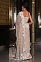 Featuring a peach draped saree in organza base. It is paired with a hand-embroidered corset blouse. Accentuate it with minimal zircon jewellery and a sleek hairdo for a stylish ensemble, ideal for receptions, modern evening events or upscale festive celebrations.