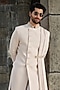 Featuring a beige sherwani in imported fabric base with an attached dupatta, zardosi and cutdana handwork. It is paired with pants. Style it with mojaris for a festive occasion, wedding or engagement ceremony, exuding traditional charm and elegance.