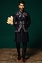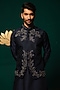 Featuring a black jacket in silk base with zardosi and cutdana handwork. It is paired with a kurta and pants. Style it with mojaris for a wedding, sangeet or engagement ceremony.
