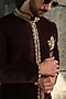 Featuring a brown jodhpuri in velvet base with zardosi and cutdana hand embroidery. It is paired with pants. Style it with mojaris for a sangeet, wedding or engagement ceremony, exuding traditional charm and elegance.